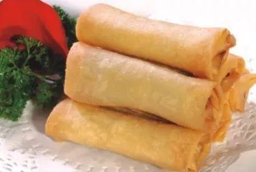 制作方法 :炒锅烘热,用油滑锅,放油150克,将肉丝、菜丝煸炒后,加汤、盐、味精略烧,淋入湿淀粉,稍翻炒,出锅,冷却后即成馅心。在饭粢上稍洒水,使其柔软,一裁为四,成四片三角形,包上馅心即成春卷坯。