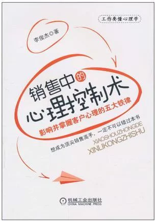 《销售中的心理控制术》是2011年机械工业出版社出版的图书。作者是李俊杰。本书共介绍了五大销售心理控制术,每个大类下面又分别详细地讲解了不同的销售技巧。
