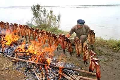 烤鱼时先用红柳枝条把鱼穿好插在火堆的周围然来自后慢慢烘烤,这种特别的烤鱼技艺只有在沙雅当地才能见到。