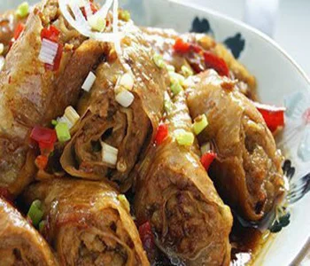 豆腐皮包白干猪肉是一道菜品。原料为豆腐皮,猪肉他策否川映的,白干等。