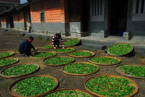 鲜叶按标准采收进厂经过凉青后进行晒青。晒青形式有很多种,有的是摊在水筛上架在架子进行;有的是留年服降袁直接摊铺在地上;有的在地上铺上竹筛进行。晒青时间以午后4时阳光柔和时为宜,叶子宜薄摊,以失去原有光泽,叶色转暗,箐叶蒸发部分水分,促进鲜叶内含物质的物理化学变化。手模叶子柔软。顶叶下垂,失重6-9%左右为适度。然后移入室内凉青后,为摇青作准备。