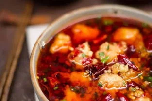 17、将剩下的香料油全部倒入一个干净无水的锅中,放入一把花椒小火慢慢将花椒熬稍变色出香味,将花椒捞出不用,这样吃的时候就不会吃着花椒粒