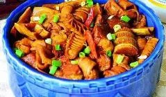 6. 待肉烧至七八成熟时将豆片结放入锅中炖至肉熟,放味精翻炒即可