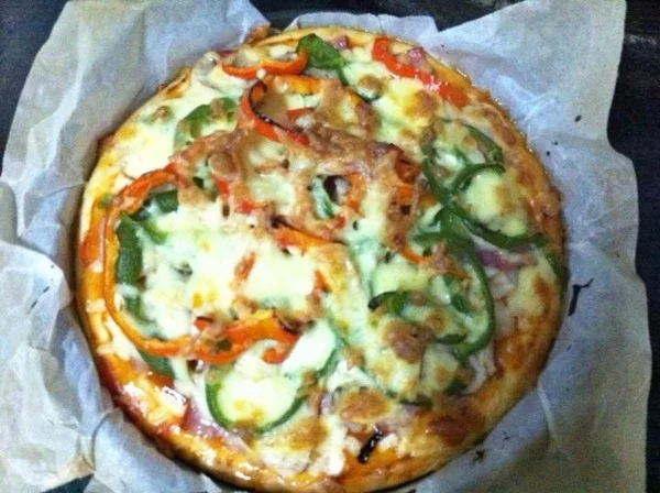 16 烤箱开200度,上火,预热5分钟,把披萨盘放入,烤20分钟.