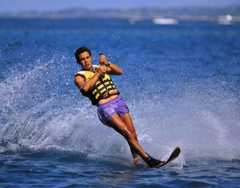滑水:直白地说,滑水就是人借助动力的牵引,在水面上"行走"的水上运动。所谓动力又分成好多种,有用汽艇的,有用电动索道的,甚至有用汽车、直升飞机的,总之,前面有东西拖着你,你又在水上滑,就是滑水。