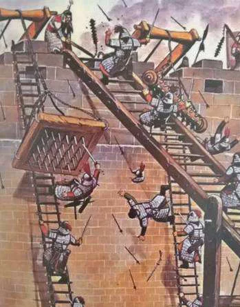古代守城武器。 明茅元仪《武备志·器式》:“狼牙拍,用榆槐木枋造,长来自五尺,阔四尺五寸,厚三寸。以狼牙铁钉数百个,皆长五寸,重六两,布钉於拍上,出木三寸,四面嵌一刃刀,四角钉环,以绳滑绞於滑车,钩於城上。敌人蚁附攻城,扯起拍落下,自难攻也。”