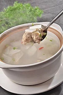 2.锅炙好,下入熟猪油,下入葱段、姜片、白胡椒粒爆香,烹入绍酒,加入奶汤、精盐烧开,用细箅子打尽葱丝、姜片、胡椒粒,下入飞水后的冬瓜条,旺火煮开,至冬瓜条刚熟,调入味精,盛入调好醋、胡椒粉的盅子中调匀,撒上葱白丝、香菜段、香油即成。