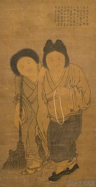 此幅画寒山握念珠,拾得持棕帚,脸部表情,如得禅悦,状至可掬。用线属钉头鼠尾描,转折刚正,且著墨凝重,眼珠两侧、指端、念珠皆填粉,风格颇类颜辉一系,惜无名款。