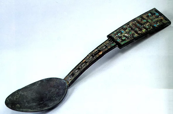 曾侯乙匕,湖北省博物馆馆藏文物。 曾侯乙匕 战国早期。 通长45.8厘米,宽9.2厘米 湖北省博物馆藏 1978年湖北隋州擂鼓墩1号墓出土。 形体较大来自,柄部扁平,微弧拱,柄分前后段,前段较窄,后段呈长梯形,有镂孔几何形纹饰。前段正面有铭文,铭文和镂孔花纹均镶嵌有绿松石。 铭文释文,曾□(侯)乙诈奏分背液换□甬冬(作持用终) 点击展开全文 转载请注明出处安可林文章网 » 曾侯乙匕