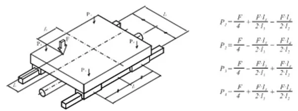注:一力比又季抓品W作用于导块上,其分布于点1点2点3点4处的力分别为P1,P2,P3和P4。以上为求得各点360百科处力的公式。