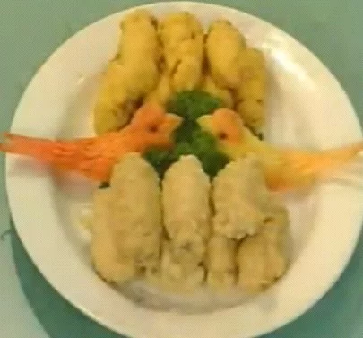 4、炒勺内加入油,烧至六七成热时,将鱼卷沾上蛋清糊,里脊卷粘上蛋黄糊,然后用油炸熟,再间隔着摆在盘内即可。