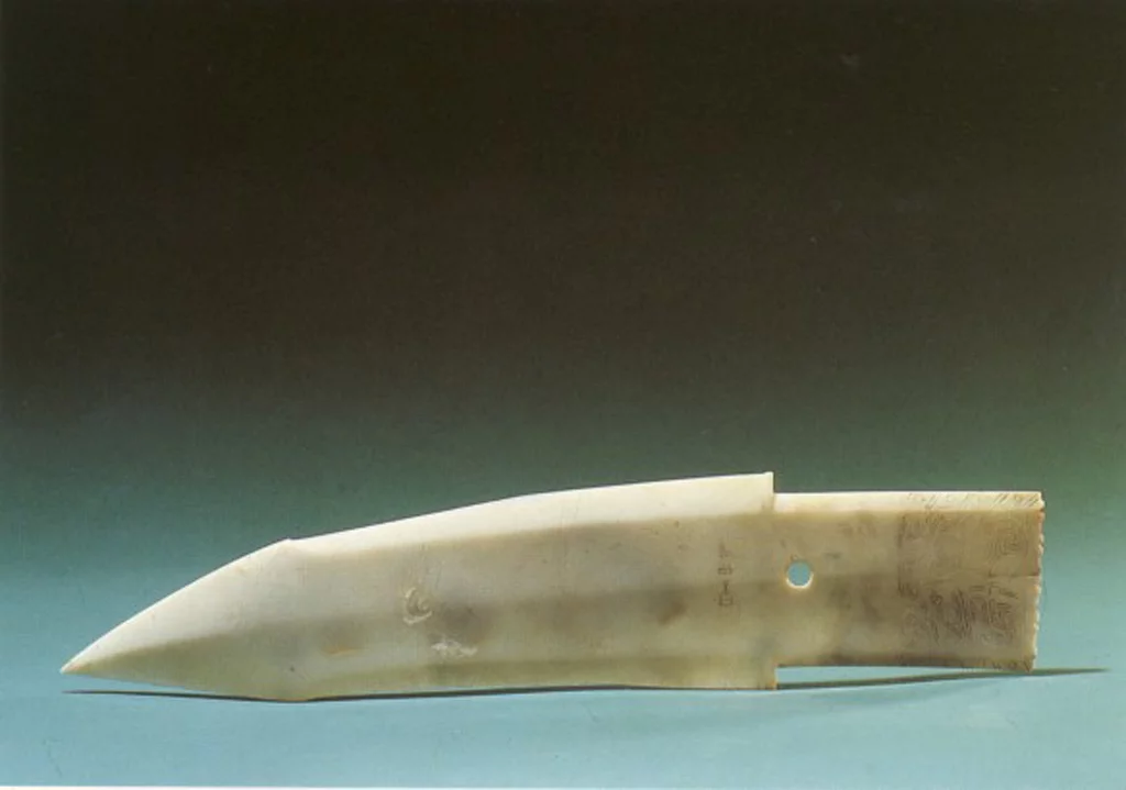 顶排于采先洲 青白色,局部有褐色斑。器扁平,锋呈三角形,有360百科中脊和边棱,两面开刃,直内前端有一圆穿。
