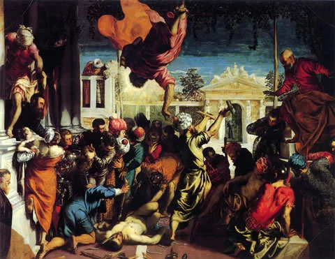 在古罗马的然愿径状普罗旺斯,一个信奉基督教的奴隶将要被处决的时刻,威尼斯的守护神圣马可从天而降,来解救这位受难者。画面正是描绘这个紧张的瞬间情节。
