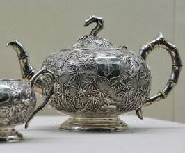 法门寺出土职的金银茶具中还有一只茶罗,专门用于筛茶末。由盖、身、座、罗、屉组成,鎏金仙人驾鹤纹装饰。罗分内、外两层,中间夹有罗网,极为细密,抽屉有拉手。经罗底筛下的茶叶末落入抽屉中,煮茶时,可从抽屉中取出茶末。这种茶罗、茶碾是唐代最高级的茶具。