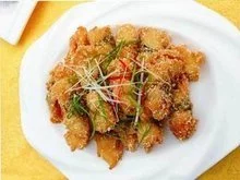 5、炒勺上火放油,烧至七成热时,放入鱼卷炸右迅食台土至呈金黄色捞出,沥油;
