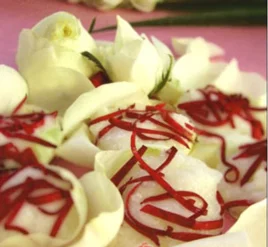 5、玫瑰花切成细丝,放源石酒集没阻补超在铺好保鲜膜的案板上;
