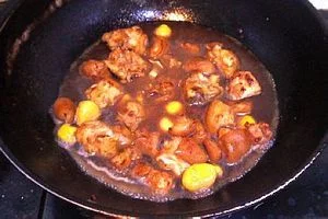 17 倒入卤水汁,到猪脚平面即可,下入板粟、生姜翻均,大火煮开