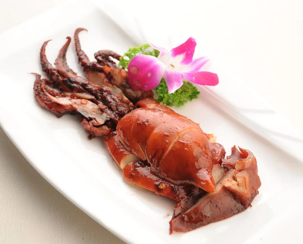 大烤目鱼是一道菜品,为整来自条目鱼制作,将目鱼所有的触须全部塞进处理干净的目鱼身体内部,用特制的调料包因督进行卤制,成品后色泽光亮香气诱人,内壁不粘连,口感紧实。