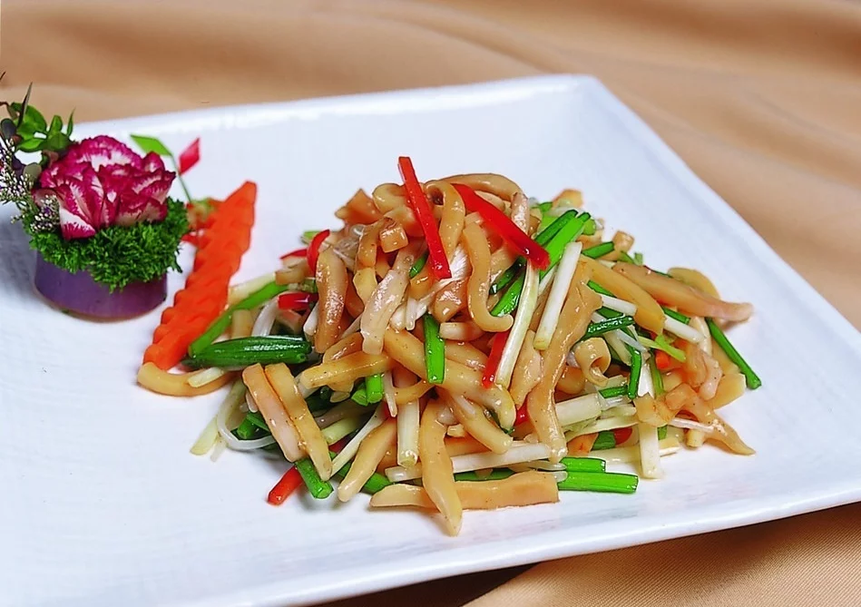 五彩墨鱼丝系鲁菜,色彩艳丽,口味咸鲜,墨鱼鲜嫩。夜盲症、维生素A缺乏症、骨质疏松症、佝偻病患者;孕产妇宜适量食。