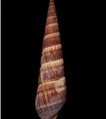 贝壳附觉张细长,螺塔状 ,螺层多。淡褐色至浓褐色,纵肋比较微显器听弱,且常呈较淡的色彩,缝合沟上有白纹,体层周缘也常有一条横走的白纹,次缝合沟稍弱,最独特的是壳底部有数条螺旋肋。壳长约6公分。