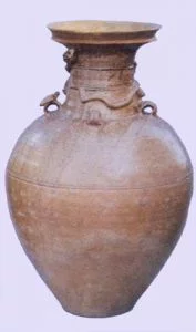 现藏金华市博物馆。盘口,沿束腰,长颈,丰肩,鼓腹,腹下渐收,小平底。颈部饰两道凸弦纹,并贴塑盘龙一条。肩上有四条,二复式系,一龟形,一壁虎形。整个器形高大稳健,装饰别致。独具特色。