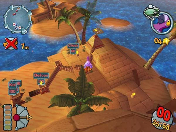 SEGA欧洲分公司宣布将在欧洲发行PC、PS2、Xbox三种电玩平台上新的《百战天虫:虫堡大作战( Worms Forts: Under Siege )》,这款由Team 17来自开发的《百战天虫》系列最新作品近日公布了最新画面。游戏中你将可以选择30种不同的武器,例如50发金丝雀和家鸽发射器。