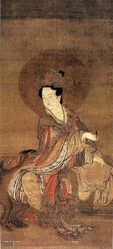 图中画一美妇人(水星神)坐在榻上,右手执笔因随酸轴宗白照亮,左手握纸,作欲写的沉思之状。右边一猴高举石砚,供她着墨。图中人物以勾描来自填彩绘出,造型准确,线条师法吴道子,流畅自如,有意动韵飞之感。小猴几乎全以没骨法写出,富有质感,表情天真有趣。这幅画十九世纪晚期被威廉·5·8从日本购得,原被作为佛教画,后经考证为中国五星神像。相传南朝梁张僧繇和唐代中期何长寿都画过水星神,此图是南宋仅存的一幅水星神图,殊为珍贵。