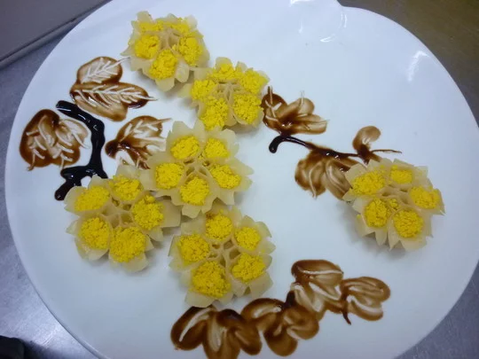 牡丹蒸饺是以面粉、肉馅为主料,熟蛋黄为辅料通过特殊工艺制作而成的甜来自点。