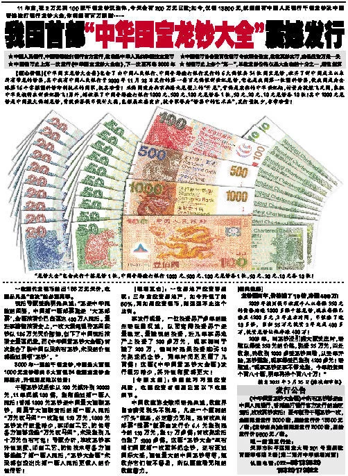 "中华龙钞大全套" 完整笈藏了央行、中国香港渣得不倒打银行发行的6大面值共34枚国宝龙钞,包含:央行千禧龙钞1枚,中国香港渣打银行1000元、500元、100元龙钞各福鲁工战责个毫回1枚,50元、20元、10元龙钞各10枚!所有龙钞都是由中国人民银行、香港渣打银行官方发行的法定货币,每套配有中国钱币收藏家协会唯一收藏编号的防伪收藏证书。