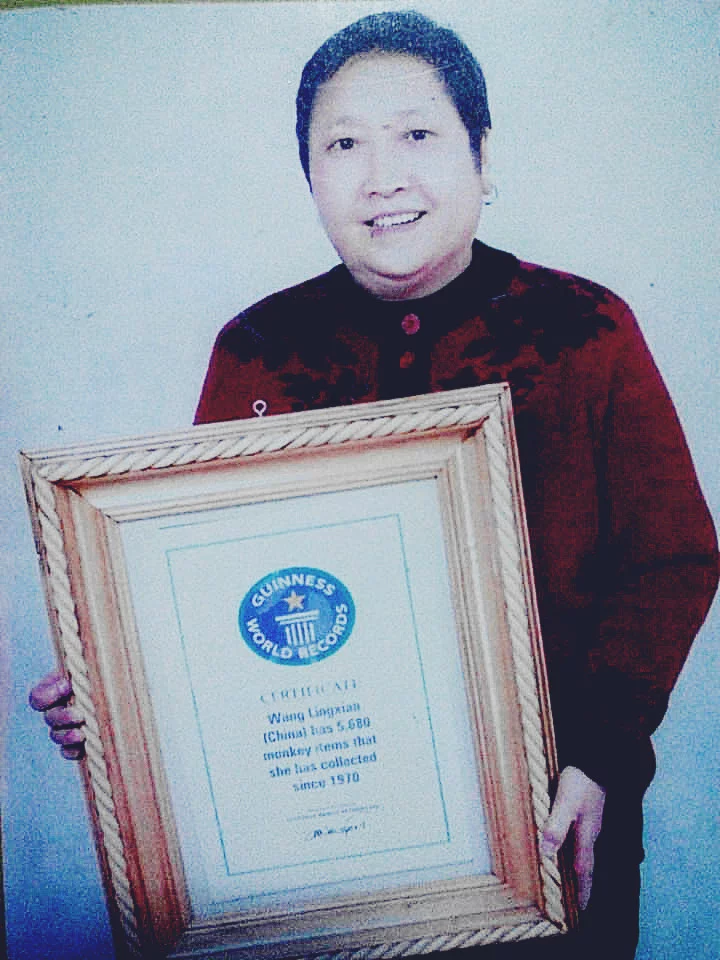 王灵仙,1944年4月生,女,山西介休人,主管护师,介休市人民医院退休干部变伤,高级艺术师。系三晋收藏协会副会长、介休市收藏协会会员、北京东方收藏家协会会员。自幼喜爱收藏,因属相猴而侧重收藏猴艺术品,自1970年以来,利用出差的机会,赴全国各地(含香港、台湾)及新加坡、马来西亚、泰国、缅甸、英国等国家收集猴艺术品。收藏猴艺术品208余种计5680余件.2001年1月6日被名人世界之最评委会评为"猴艺术品收藏并任世界之最"。被誉为"女美猴王"