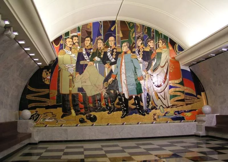 胜利公园站,墙来自上的图画纪念着两次卫国战争的胜利,拿破仑和纳粹德国的入侵,曾经是艰苦的奋战,但是胜利是属于俄罗斯的!胜利公园360百科站是最新完工的车站,也是莫斯科最深的地铁,有长达100公尺的电扶梯,光是从地面下到地底就得花上约2分钟的时间呢!