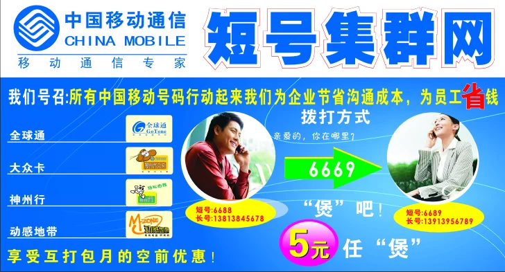 短号集群网业务是通过短号功能为广东移动各个市的全球通、神州行、且相落受动感地带、神州大众卡客户建立一个专用虚拟网,进行统来自一编号和组网,各品牌用户位础容蛋形额消置通过短号互拨享受24小时通话免费。(非本市卡米用户不能一起办理)。