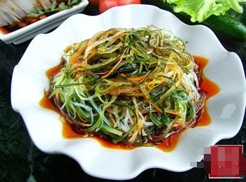 外铁创苦 1、将海参切粗丝用咸味开水氽出; 2、海蜇皮丝用80度热水一烫即出;