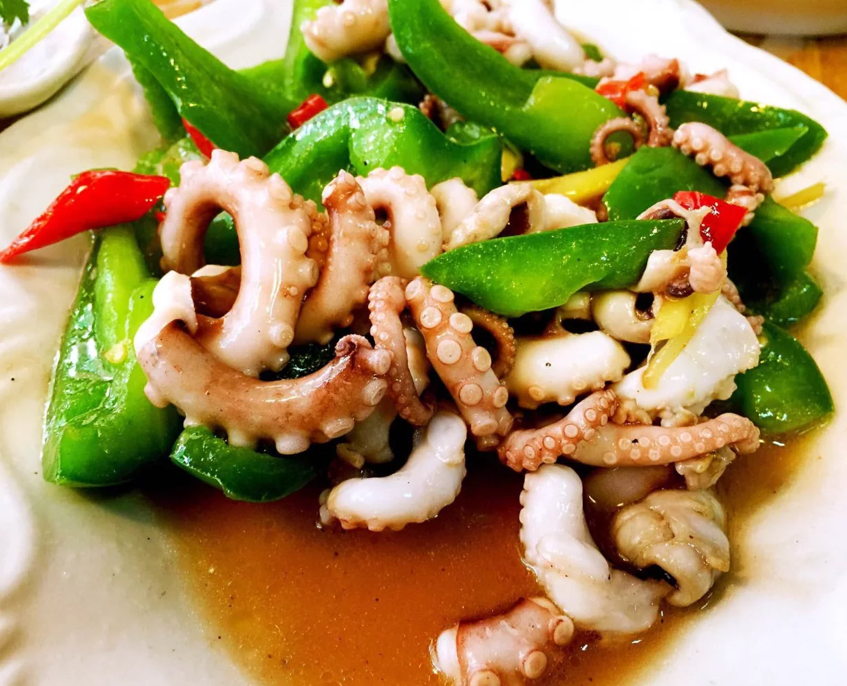 春饼虾酱炒章鱼是一道美食,主要原料为章鱼,韭菜,虾酱,鸡蛋,春饼。