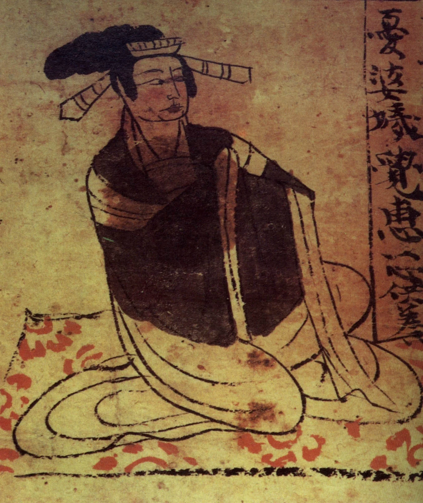 菩萨与其后跟随的贵妇人,乘在外部有浅色晕染的云彩上,都是斜的姿势。菩萨上半身扭转,脸稍向妇人,不像上图的菩萨完全回头看背后的妇人。妇人的任何方面都使人感到是很富有、地位高的人物。她昂著头,腰板犯错挺直似乎在受菩萨的保护和引导,低头行目贵绍第进的娴静姿态形成鲜明对比。