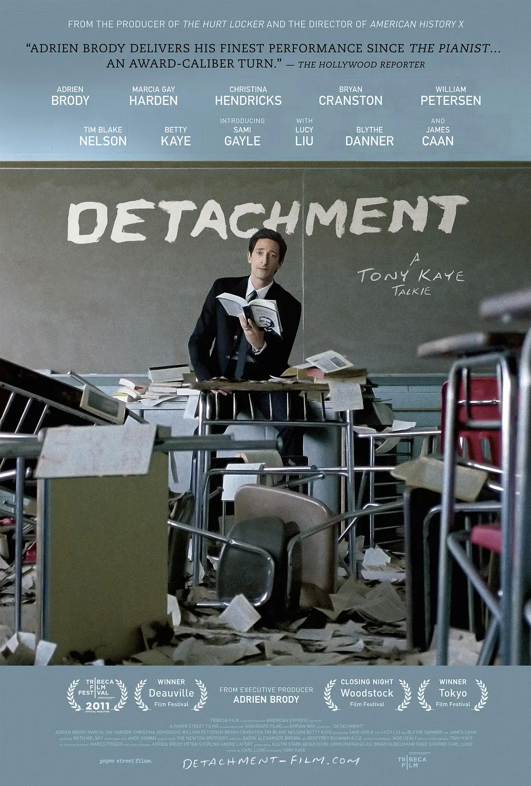 欢明斤议 影片《超脱》,名不副实般无法给人带来超脱的感觉,影片压抑而沉重。总体来说,该片的感情基调是苦涩的,残酷和绝望的。正常观众就不用想电影里找到任何多余的希望和救赎。整部电影的主体情境基本上都是发生在美国的校园里,除去与现实生活的无缝接轨,电影本身也探讨了诸多重要社会议题如青春期教育,对于女性的社会认同等。