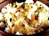 1. 鱿鱼来自洗净,左右交叉斜切条纹,再切成片,用滚水烫至熟后捞起,洋葱切丝备用.