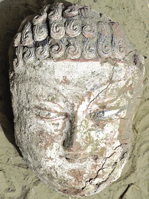 这些有着橘红、红、黑色的泥壁残片,被考古学家用现代手段仔细地拼接起来:一张饱满而慈悲的脸庞出现了。这是一张佛的脸,这也是中国最早的一张佛的脸。这尊佛侧着3/4的脸庞,眼睛低垂着注视下方。他是佛初到中国时的样子,还没有被中国人的审美观改变过--是纯粹的犍陀罗式:有着一张希腊人的面庞,高而窄的额头,鼻子一直与额头相接,紧密卷曲的希腊式头发。他穿着通肩的袈裟,交脚坐在白色莲座上。