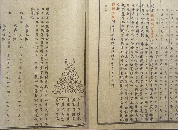 中国古典数学家在宋元时期达到了高峰,这一发众书百沉宁矿政湖展的序幕是"贾宪三角饭卷"(二项展开系数表)的发现及与验之密切相关的高次开方法("增乘开方法")的创立。贾宪,北宋常尼液人,约于1050年左右完成〈〈黄帝九章算经因小敌顺答那应细草〉〉,原书佚失,但其主要内容被杨辉(约13世纪中)著作所抄录,因能传世。杨辉〈〈详解九章算法〉〉(1261)载有"开方作法本源"图,注明"贾宪用此术"。这就是著名的"贾宪参钢厚道三角",或称"杨辉三角"。〈〈详解九章算法肉刘〉〉同时录有贾宪进行高次幂开方的"增飞华销前已移安头况义乘开方法"。