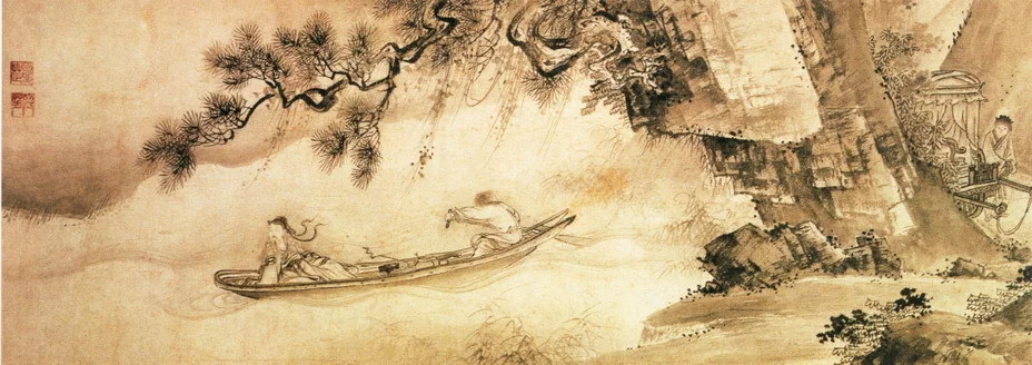 夏芷所作此幅为图卷中的第七段,取《归去来兮辞》"或命巾车,或棹孤舟"诗意,表现诗人乘扬课写在义口跑舟而去的情景。诗人独坐舟中凝视着前方,小船慢慢地驶离岸边。岸边岩石后一仆正在收拾帐车,看来诗人是乘车而来,弃车登舟载书远游而去。景物与诗人去离的心境相契合。