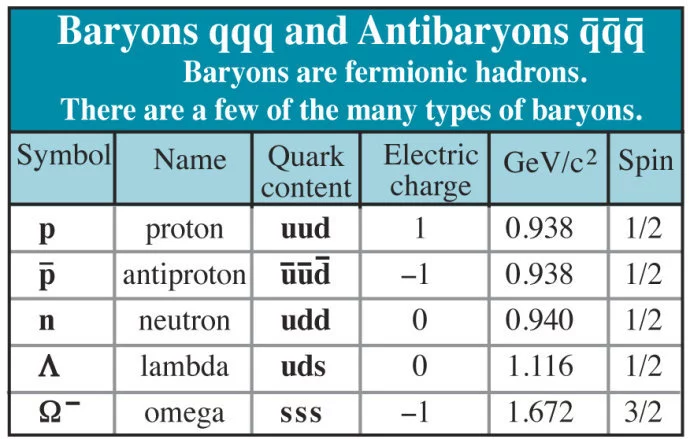 强子族本身又再分为两类。由三个夸克构成的粒子叫做重子,就是我们常说的'物质'粒子,包括质子和中子(重子和轻子都是费米子族的成员,费米子实际上是普通物质粒子的别称)。由成对的夸克构成的粒子叫做介子,它们是携带基本力的粒子,尽管还有其他的介子(这些力的载体和其他介子又称为玻色子)。