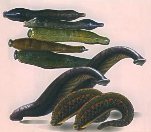 2. 长条水蛭:采收方法同上,惟捞出后用线穿起,体的一端拉长,挂在阳光处晒干。