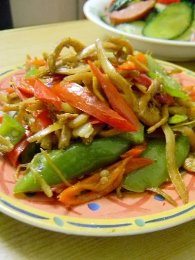 3.再次来自倒入面条鱼与辣椒一起炒,放入少量盐,鸡精小炒一会,,关火即可食用。