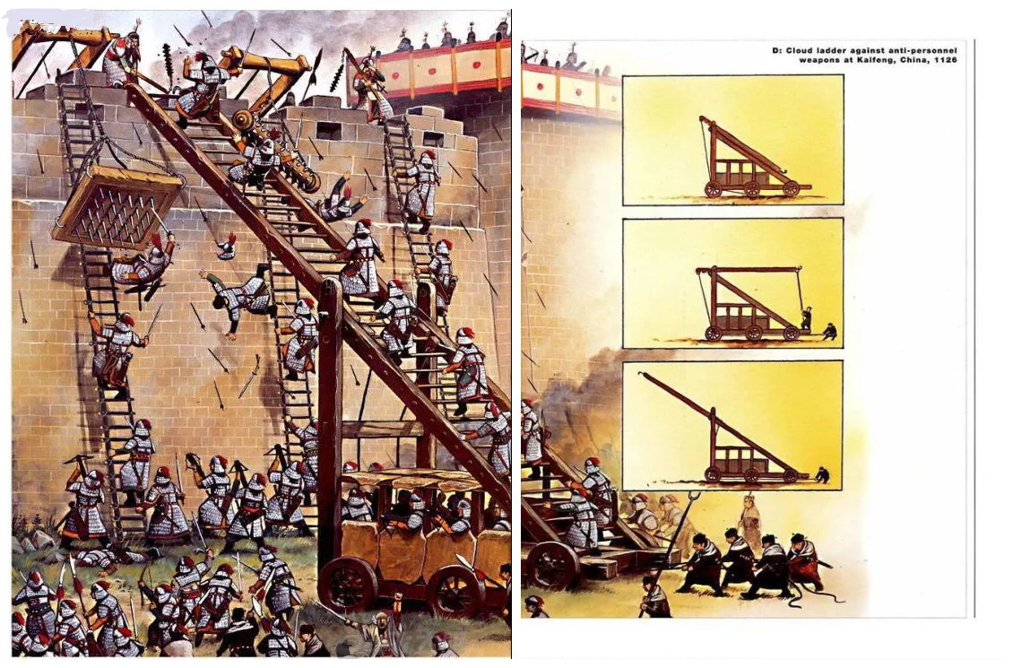 3、渡濠器具:宋代濠桥的长短以濠为准,桥下前面有两个大轮,后面是两个小轮,推进导初入濠,轮陷则桥平培和湖宗可渡。如果濠阔,则用折迭桥,就是把两个濠桥接起来,中间有转轴,用法也相同。