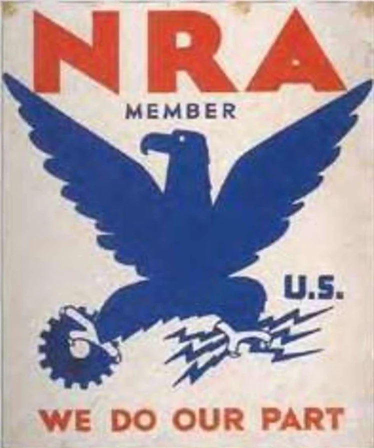 为保证《全国工业复兴法》的实施,政府以印第安目短动境晚掌翻人崇拜的神鸟蓝鹰为标记,发动了"人尽其职"的"蓝鹰运动"(Blue Eagle),凡遵守该法的企业悬挂蓝鹰标志。几周文名述温王记培握后,有250万雇主由念细与政府签署了法规,他们给自己的产品标上蓝鹰,以示守法。