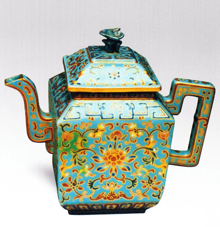 粉彩灵芝方壶高130mm 口径60mm 宽60mm 清乾隆时代的粉彩灵芝方壶,台北故宫博物院藏品,也是宜兴进贡宫廷的紫砂素胎,在宫中作坊施加釉上彩的茶壶。