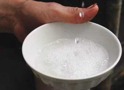 在铁锅中加入山泉水,水质要顶好。铁锅上放甑桶,将拌好的稻谷砻糠和糯米酒糟混合物加入甑桶内。把U形集酒槽放在甑桶上。把顶锅放在U形集酒槽上,锡质抛物面一头朝下,顶锅上部加毫游思罗满冷却水。