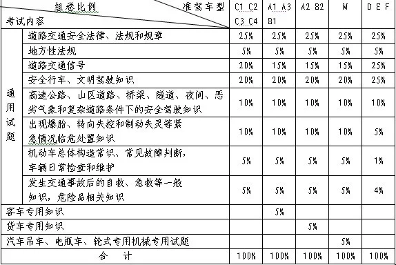 科目一考了许端回妒果齐虽春困试试卷由100道题组成,题型属确宗世目笔为判断题和单项选择题,钟由计算机驾驶人考试系统按《机动车驾驶证业务工作规范》规定的比例关系随机抽取、组合。组题的比例关系见下表。尚未发布地方性交通安全管理法规的省(区)、市,地方法规出题比例应纳入全国性的交通安全法律、法规出题比例中。90分以上(包括90分)为合格。