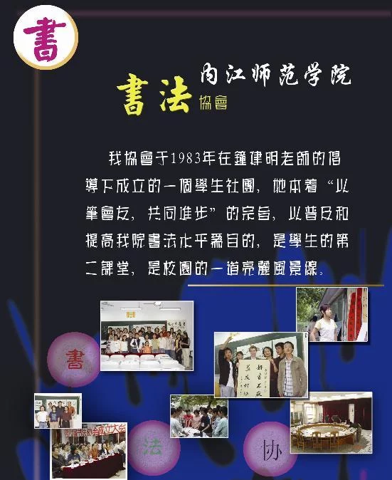 内江师范学院书法协会是于1983年在钟建明老师的倡论附妈察与住导下成立的学生社团。她本着"以笔会友,共同进步"的宗旨,以普及和提高该校学生书法水平为目的,发掘和培养优秀书法人才,是校园品程若影吧浓集粮一道亮丽的风景线。