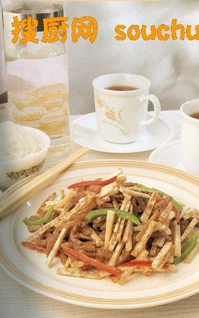 4、烧热油两汤匙,爆香姜丝、蒜蓉、笋丝、青椒、红椒,牛肉回镬炒匀,洒入酒,拌匀芡汁料埋芡,放下炸芋丝,兜匀上碟。